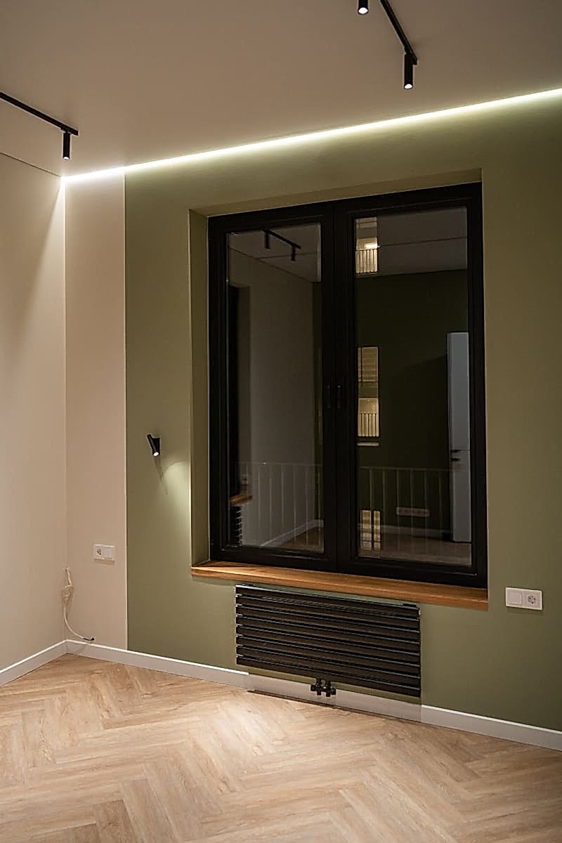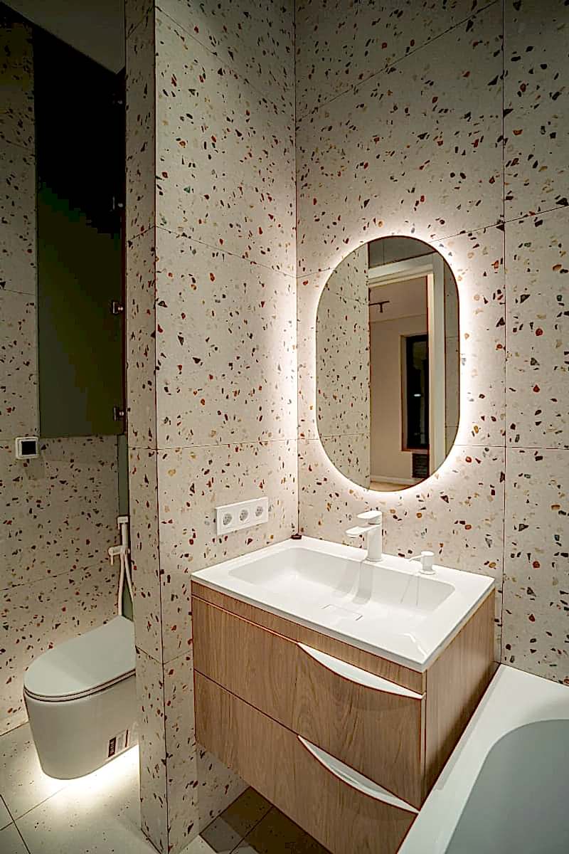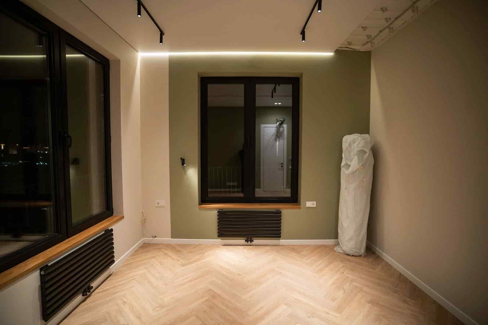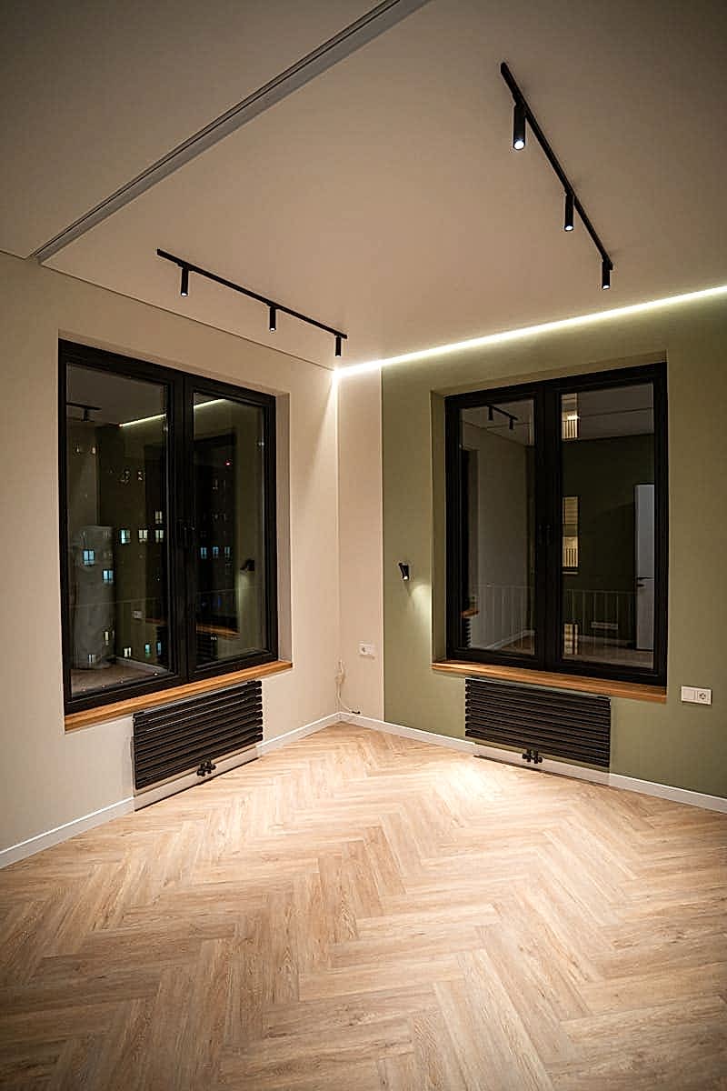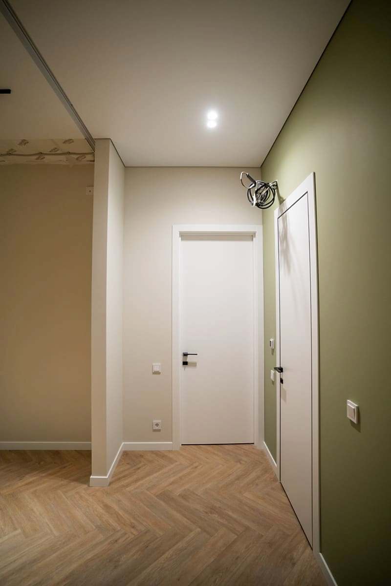 Площадь: 93 м², срок: 5 мес., общая стоимость ремонтных работ с материалом, кухонным гарнитуром и мебелью для ванных комнат: 8,3 млн. ₸.
