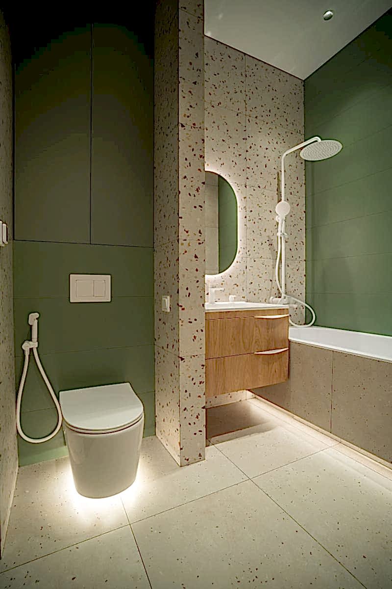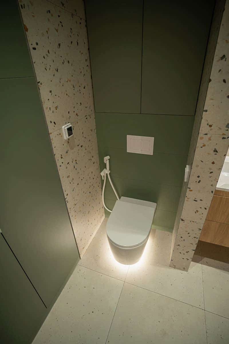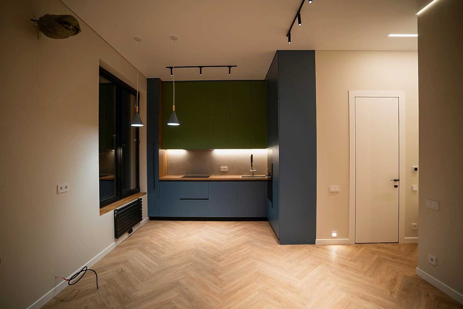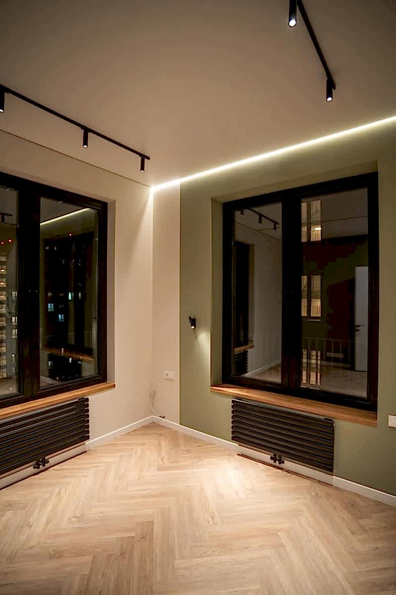 Площадь: 93 м², срок: 5 мес., общая стоимость ремонтных работ с материалом, кухонным гарнитуром и мебелью для ванных комнат: 8,3 млн. ₸.