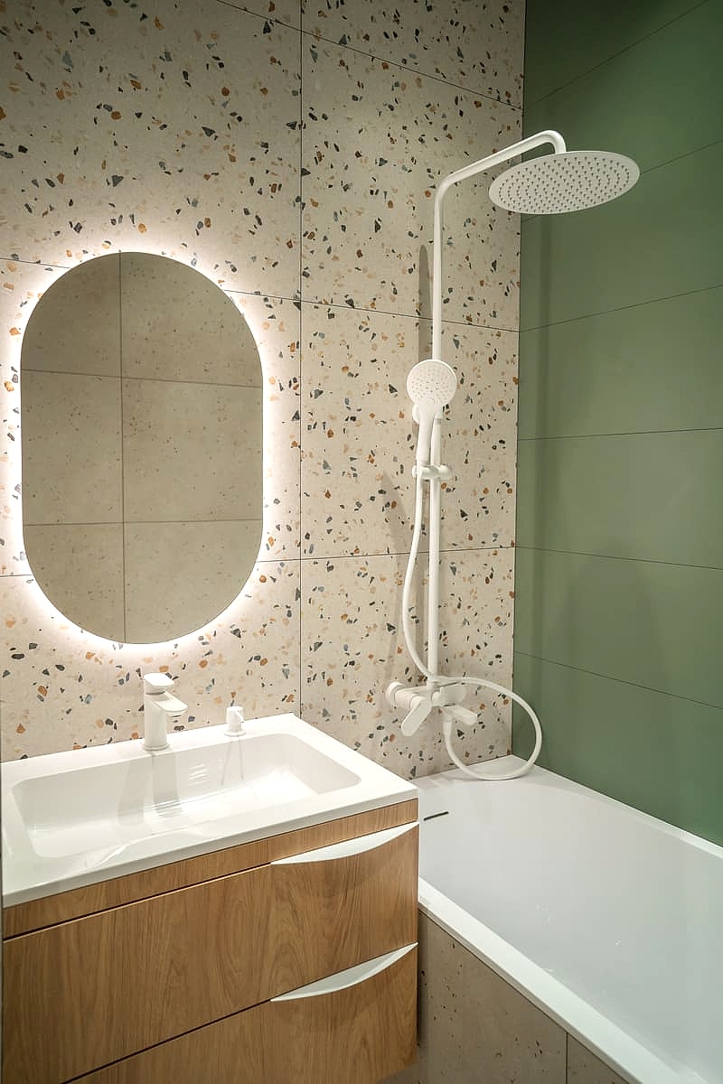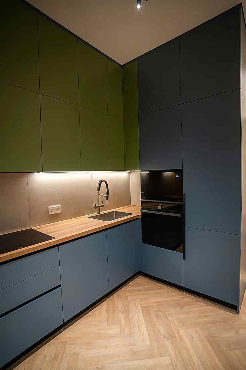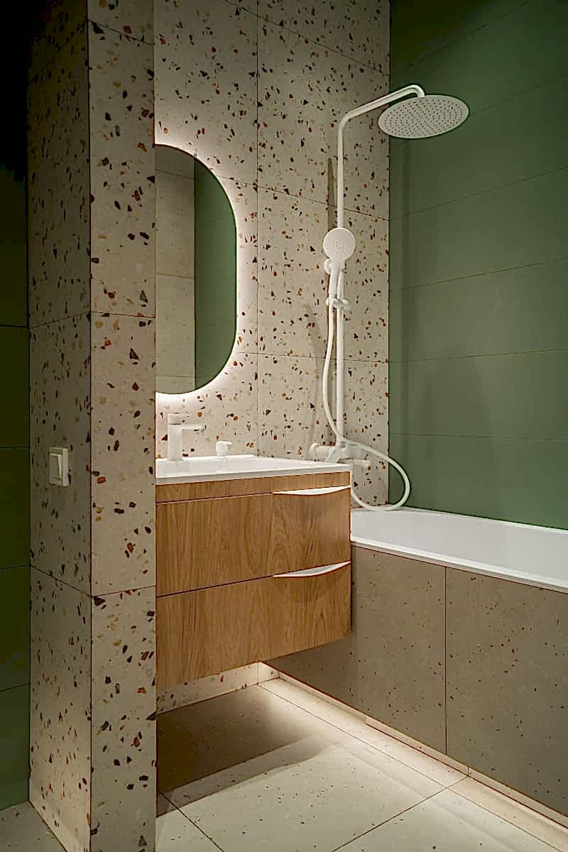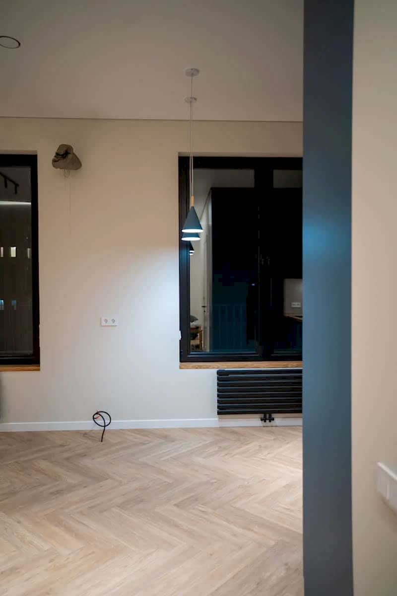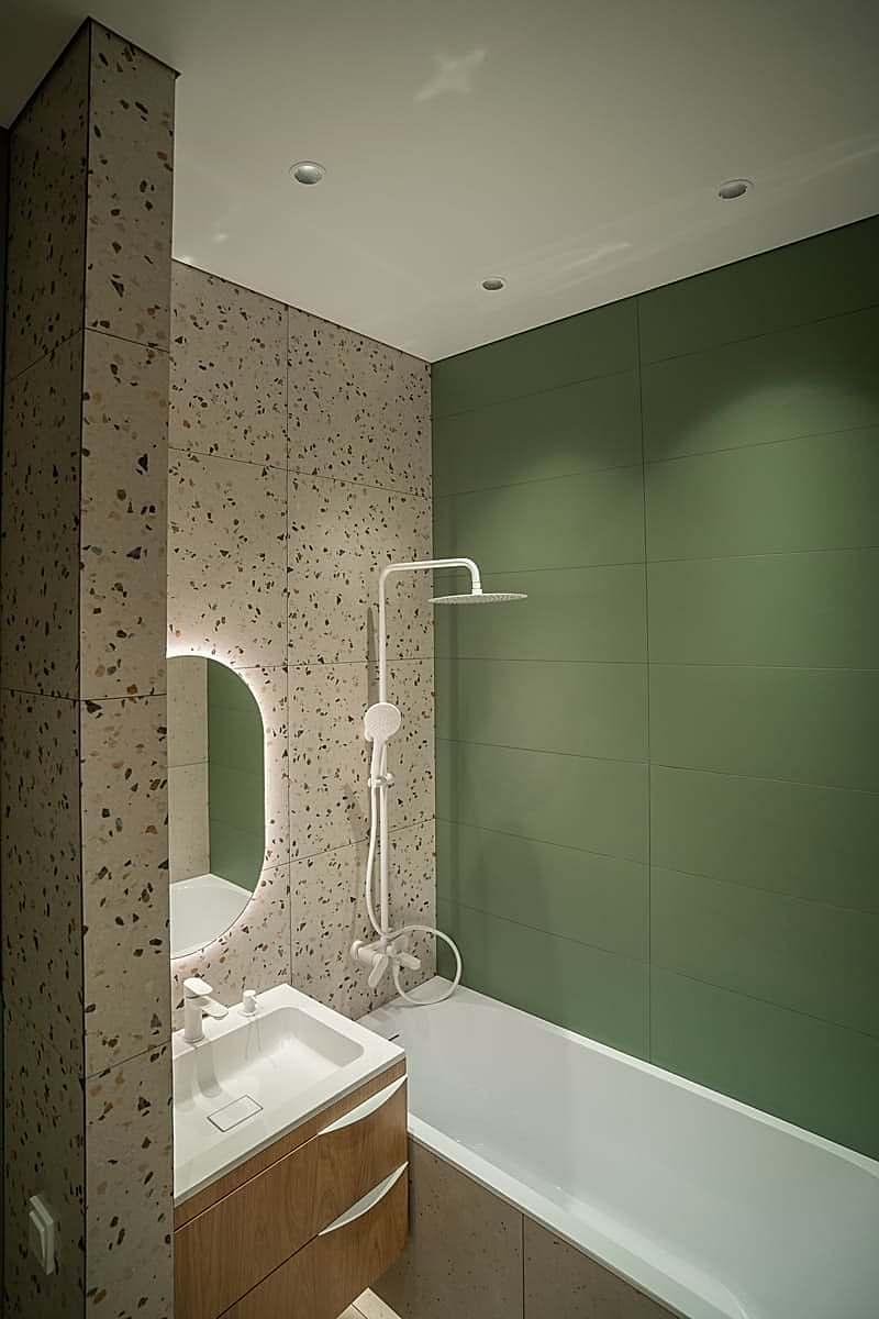 Площадь: 93 м², срок: 5 мес., общая стоимость ремонтных работ с материалом, кухонным гарнитуром и мебелью для ванных комнат: 8,3 млн. ₸.